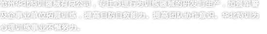 滄州華北特訓(xùn)器械有限公司成立于2002年,是專(zhuān)業(yè)研發(fā)生產(chǎn)心理行為訓(xùn)練器械、拓展器械、拓展器材、攀巖、兒童拓展器械的專(zhuān)業(yè)型企業(yè),并通過(guò)ISO-9001質(zhì)量管理體系認(rèn)證及ISO-14001環(huán)境管理體系認(rèn)證,致力于各職業(yè)群體提供的心理行為訓(xùn)練器械、拓展器械、攀巖、兒童拓展器械等設(shè)備,使之不斷提升心理健康水平、充分開(kāi)發(fā)自我潛能。我公司竭誠(chéng)為廣大客戶(hù)提供專(zhuān)業(yè)化各類(lèi)心理行為訓(xùn)練器械相關(guān)產(chǎn)品和服務(wù)。
